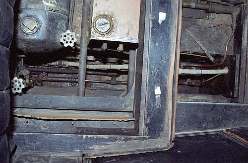 The Pump Box Under The Front Seat Cushions And Footboard Looking directly down into the pump box clearly shows the kerosene piston pump and the reciprocating arm that operates the four pumps in the pump box. Not as easily seen are the two water pumps and the steam cylinder oil pump. The valve handle between the black pilot tank and copper steam cylinder oil tank is the kerosene fuel supply shut-off valve. If the pressure needs to be bled off of the kerosene fuel service tanks the second valve handle at the lower right can be opened to return fuel under pressure to the kerosene supply tank which is always maintained at atmospheric pressure. The white insulated line in the photograph is the main water supply from the two water pumps to the boiler. |