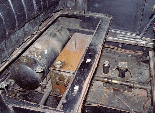 Under The Front Seat Cushions The black tank is the pilot fuel tank. It was un-nerving to realize that the tank will full of gasoline and had to be pressurized to 25 PSIG for operation considering all the cuts and welds that have been made to the tank. The copper tank is the steam cylinder oil tank. The two plumbing elbows on the side of the tank I was told were once set up to circulate steam to a coil in the tank for heating the oil to make it flow better. This photograph also shows the hand water (to the right) and hand fuel (to the left) pumps located under the front footboards. The “Stanley” water level gauge is the smaller of the two gauges and is at it normal position and height. The larger one was added by Marvin Klair. |