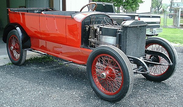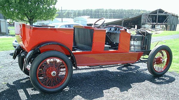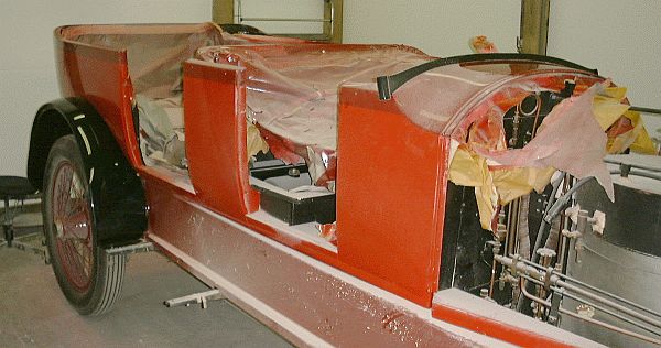 One part of the body ended up having more paint on it than any other part of the car. The lower portion of the windshield was initially painted light red when the car's body was painted. It was then painted dark red when the accent stripe painting was done around the top edge of the body. As shown in the above photograph it finally ended up black to match the windshield frame and support pillars.
