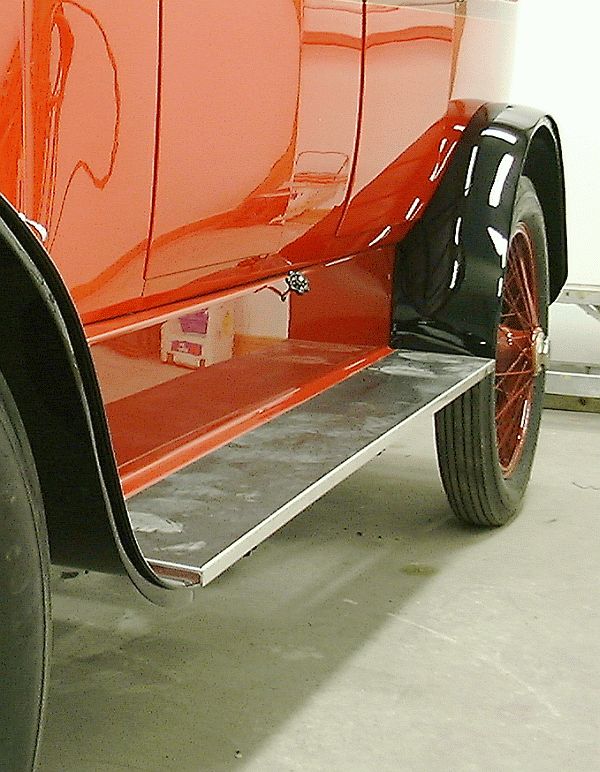 Both running boards were replaced with new 5/4 wooden panels. For many years linoleum was not available in the US however in recent years it has made a comeback and is once again available. Often folks call todays vinyl floor materials "linoleum" however true linoleum is manufactured from linseed oils and has a jute rope backing. The running boards as well as the front floorboards are covered in black linoleum manufactured by Forbo Corporation (www.forbo-flooring.com). The product selected is Forbo's Marmoleum Walton 123 and it was applied to the wooden running board using Forbo's L910 adhesive. The aluminum edging for the running board is made by Youngstown Aluminum Products (www.yapinc.com). The product is Youngstown's #944 Aluminum Edge Molding which they polished.