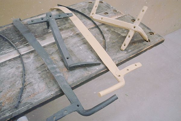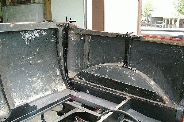 The above photograph shows the two left side top supports in place. Note how they have been forge bent to match the contour of the body and wooden body support members. The front support is threaded for a nut and is where the metal top bow socket assembly mounts and pivots. The rear support holds a bracket that supports the wooden top bows when the top is stowed at the rear of the car.