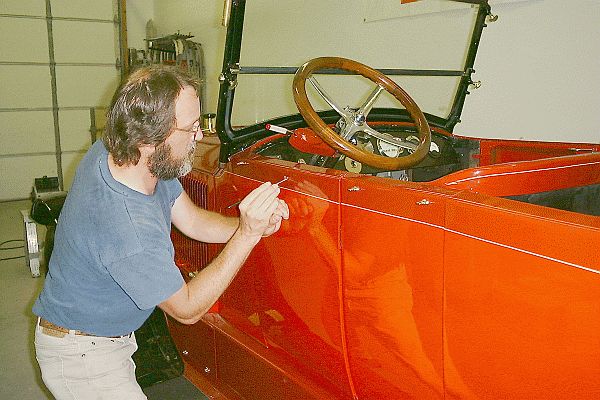 Art Simpson, owner of Art Signs, paints the owner's initials on the driver's door. Already painted is the pinstripe dividing the two shades of red on the body of the car along with an pinstripe across the rear of the front seat.