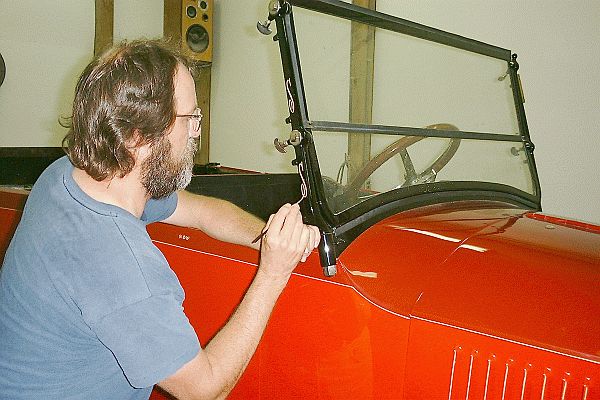 Starting at the condenser shell the pinstripe runs along the edge of the upper hood panel, follows the body curve at the windshield and then continues around the side and rear of the car dividing the darker red from the lighter red. The paint used for the pinstripe is Sign Painter's One-Shot in Tan