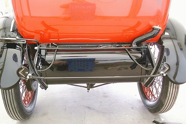 Final assembly of the car started with the kerosene tank and spare tire support hardware at the rear of the car.