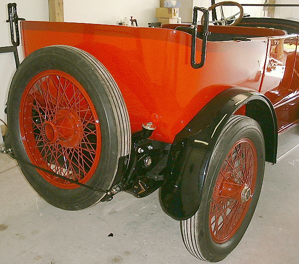 With the spare wheel in place and the pair of top bow holders mounted to their brackets the assembly work at the rear of the car is complete. The center hub of the spare tire will eventually be covered with a plate indicating the car is a 1918 Stanley Model 735.