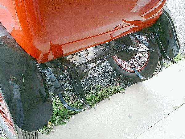 The kerosene tank was set inside its hanger straps and the straps bolted to the frame of the car. Next, the two spare tire saddles were mounted along with the turn signals. The turn signals are actually from a 1940-era truck and were added by the previous owner for safety. They were retained for safety since they look the age of the car. The bracket over the left rear fender will hold the license plate as well as the original combination tail and stop light. The two flexible cables route power to the turn signals.