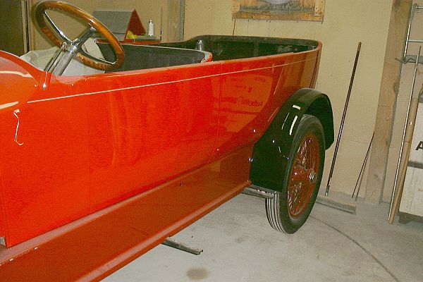In the above photograph the red splash guard ~ the metal panel which runs between the body and running board ~ has been painted darker red. The right-side splash guard had been replaced with a thin galvanized piece of metal during the 1952 restoration and had not been properly prepared. Being thin it wanted to "oil can" and this flexing caused the paint to flake off. The splash guard on the left side was original steel and had begun to rust through in places. Both splash guards were replaced with new steel guards which were formed to match the originals. As the boiler feedwater heater is mounted just behind the right splash guard the back side of this panel was insulated to reduce the heat transfer to the panel.