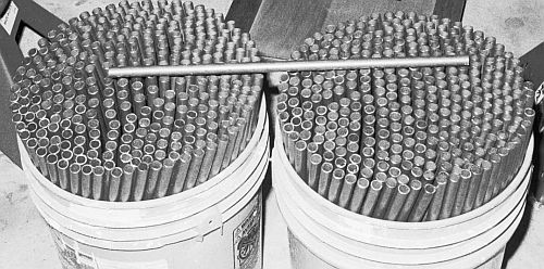 Two Five-gallon Plastic Buckets Of Flues Awaiting Installation Each of the twenty-foot lengths of carbon steel tubing was cut into fourteen flues, each flue 16-3/8" long, using a power band saw. Two lengths of tubing were cut at a time and allowed to drain of cutting fluid. Flues then had their ends sanded perpendicular using a belt sander to remove cutting burrs and to insure ends are flat. Flues were then rotated at a slight angle to the belt to apply a slight bevel to the outside edge of the flue so that there were no burrs to catch as they were pushed into the flue sheets. |