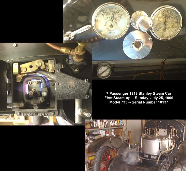 The Photo’s Caption Says It All! It took one year to the day from the time that the boiler that came with the car had failed its hydrostatic test until the replacement boiler was generating steam and steam had returned to the steam engine. The last time the car had been under steam was June 1992. The upper right photo shows the dash board gauges. 400 PSIG steam pressure is present on the boiler as indicated on the left gauge. The burner’s kerosene fuel pressure is slightly about 100 PSIG while the pilot fuel tank’s pressure is slightly over 20 PSIG. To the left center is the pilot which burns continuously while the car is in operation. The pilot maintains steam pressure while the car is at rest, it keeps the vaporization tubes hot, and it is the ignition source for the burner when steam pressure needs to be increased. At the lower right is the new boiler with wisps of steam emanating from the feed water heater to the left of the boiler. With this test now complete, the condenser would be installed and the steam from the feed water heated would be cooled and condensed back to water for reuse in the boiler. |