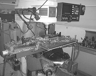 Flue Sheet Drilling The pattern of holes was laid out using a computer aided design (CAD) program called FastCAD. The use of the CAD program allowed for the accurate spacing and placement of each of the 636 half-inch holes to be drilled in the two flue sheets. The CAD program then output a file that was fed into a computer numerical control (CNC) milling machine. With both the 5/16” and the 3/8” flue sheets clamped together on the milling machine table and a 1/2-inch cobalt drill in the chuck the milling machine was left to drill the holes. Due to table movement restrictions only half of the flue sheets could be drilled at once. The sheets were then rotated 180-degrees and the remaining half drilled. Twenty hours was required to drill all 636 holes using only two drill bits. After the holes were drilled another 10 hours of milling machine time were required to cut the square flue sheets into a circle and then apply the proper bevel edge for welding. The nice thing about a CNC drilling operation is that it can progress unattended for the most part. |