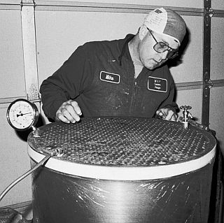 Initial Hydrostatic Test And Pinhole Leak Repair With the piano wire in place the boiler could now be hydrostatically tested. To protect the wire wrapping of the boiler the boiler was wrapped with a thin layer of plastic as seen in the photo. The boiler was filled with water to remove all air and then pressurized. Any leaks are corrected. The initial pressure testing of the boiler revealed that a number of the flues in the top flue sheet wept water. The roller was re-run on each of the flues and this quickly corrected the problem. Several of the flues on the lower (welded) flue sheet were also leaking. In this case these the leaks were in the form of pin-holes in the welds that allows a very fine mist of water to escape. In the photo the boiler is being pressurized to nearly 1,000 PSIG and the misting flues are having their welds touched up. |
