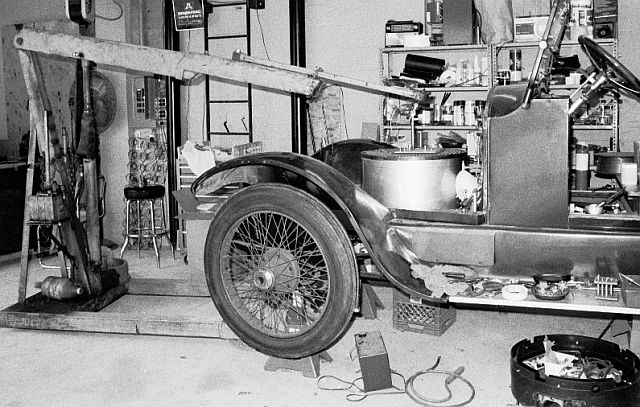 Installing A 538-pound Boiler After the boiler passed it hydrostatic testing the piano wire was given a heavy coat of steam cylinder oil. A 1/2“ thick blanket of ceramic fiber high temperature insulation was laid over the wire, and a thin stainless steel protective cover applied as protection. The same fixture that was used to rotate the boiler for wire wrapping was affixed to the boiler and used as a means to suspend it for dropping onto its mountings at the front of the car. An automotive engine hoist with an extension provided an excellent means of controlling and easily maneuvering the boiler as it was placed on its steel frame. In the lower right corner of the photo is the burner and superheater ring awaiting attachment to the underside of the boiler. |