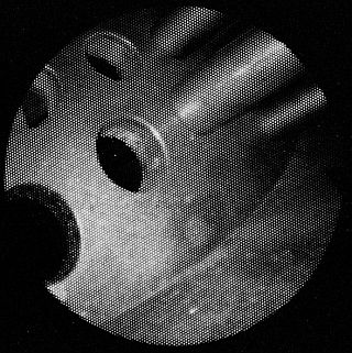 New Boiler Borescope Photo #1 This borescope photo is of the bottom flue sheet of the new boiler. Not all flues have been installed and the rounded edges of the flue sheet holes are clearly seen. Some of the flues that have been installed can be seen having been rolled tight into the flue sheet. Note how clean the interior surfaces of the boiler are. The side wall of the boiler is in the lower right of the photo. |