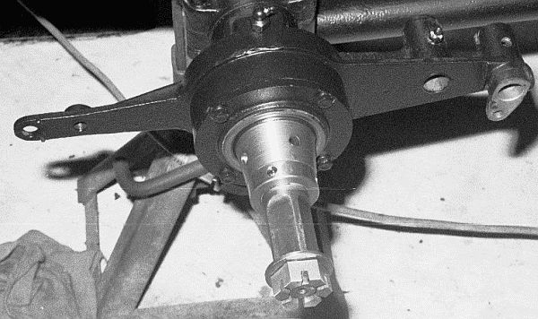 At either end of the rear axle a horizontal bracket is attached to the axle casing. The bracket holds the brake rigging in place. The above photograph shows the brake bracket for the right rear wheel ~ the front of the car is to the right. The outboard hole in the bracket with the oval tab is where the actuating bolt for the service (foot) brake shoe is installed. The service brake shoe is attached to the small hole in the oval tab is where About two inches to the left of the service brake shoe actuator hole is another hole for mounting the handbrake actuator bolt. At the opposite end of the bracket (left end) a fixed bolt mounts to the bracket to hold the handbrake shoe in place. |