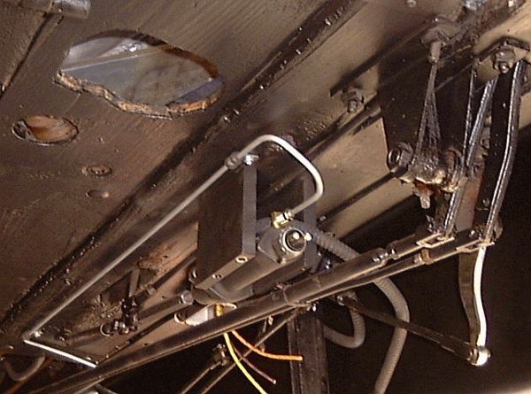Two steel mounting plates fasten the master cylinder under the car’s frame. The master cylinder is mounted between the steel mounting plates. The plates are mounted to the underside of the wooden sub-floor of the car with bolts that go through the sub-floor. A metal plate above the sub-floor provides better support than the inch thick sub-floor boards. The mounting of the master cylinder takes advantage of the existing brake pedal linkage. At the right side of the photograph are the lever arms for the handbrake (longest, far right), engine hook-up pedal (center linkage with duel rods attached), and service (foot) brake (left, with rod attached near the sub-floor boards). A rod attached to the service brake travels over the top of the master cylinder to actuate the old mechanical brake linkage. The old mechanical brake linkage arm included extra holes and one is used for the rod (hexangular rod) that actuates the master cylinder plunger. A pair of springs is attached to the linkage arm (original springs) to return the brake pedal after it is pressed. The hydraulic line to the wheel cylinders is routed along the sub-floor boards to the rear of the car. A "T" splits the hydraulic fluid to both rear wheel cylinders. A short length of flexible brake hose connects each wheel cylinder to the steel brake line to allow for the spring action movement of the axle with respect to the body. After bleeding the brake lines and installing the exterior contracting brake bands the wheels were mounted and the conversion was complete. Hydraulic fluid is supplied to the master cylinder from a small reservoir located above the sub-floor. On the end of the master opposite the piston actuation rod is a brake light switch. Seen behind the master cylinder are three wires which will connect to the brake light switch to provide power for the brake light and tail light at the rear of the car. |