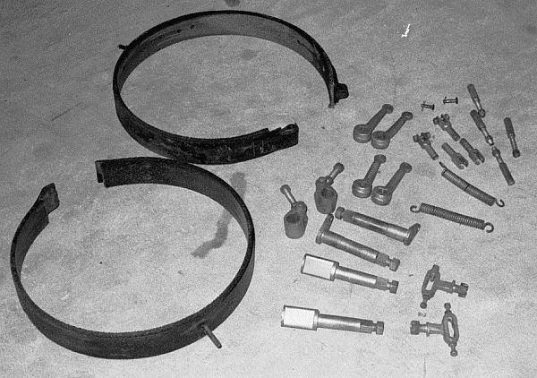 This photograph shows the assortment of hardware used to mount and actuate both the handbrake as well as the service (foot) brake. Also shown are the two flexible steel bands which wrap the circumference of the brake drum to serve as the service brake for the car. Originally the service brake shoes were lined on the inside with an asbestos-based woven material. This material performed well but unfortunately due to its asbestos content is no longer available. The modern day replacement material does not perform as well as the original asbestos-based material. One of the problems with early cars was "brake fade". If the brakes are applied for any period of time (such as when traveling down a hill to maintain a safe speed) frictional forces generate heat in the brake drum as well as with the service brake shoe band. The heat causes the service brake shoe band to expand and reduces the braking effort the band can apply to the brake drum. With sufficient heating the band expands to the point where the brake pedal reaches the floorboard and can not be pressed no further. At that point braking begins to diminish and the brakes "fade" to no stopping power at all. Today's modern brake shoe materials and hydraulic actuation systems allow a lot more heat to be generated in the brake drum and brake shoes before brake fade occurs. |
