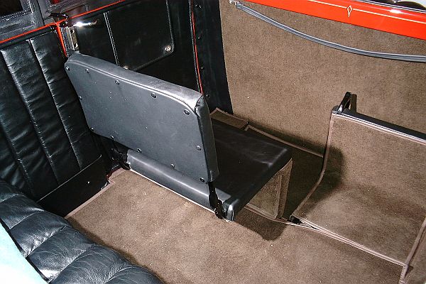 This side view of the jump seats shows the left seat in position with the seat back extended. The right seat in the foreground is stowed into a recess in the floorboards. Both seats have had carpet applied as was originally done by Shields Carriage Company. A flap is provided in the floor carpet that lays flat when the jump seats are stowed but will fold back to allow the jump seats to be used. The recess the jump seats stow into is also carpeted. |