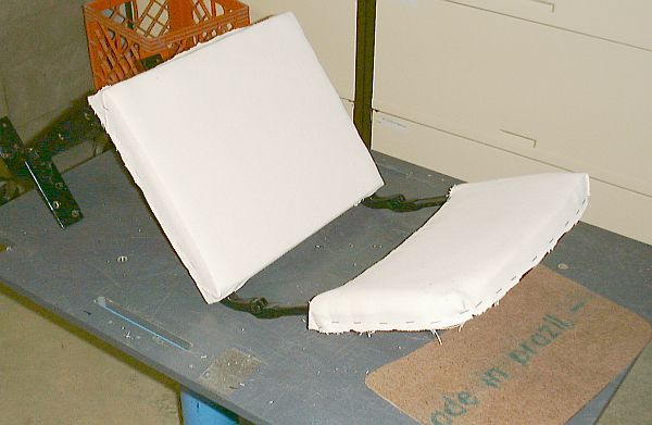 Both the seat back and the seat bottom were covered with industrial felt held in place with heavy duck cloth. A change in the manner that the seat back assembly was covered was planned. Originally the piece of leather covering the back of the seat back was tacked to the edge of the back and then a narrow trim strip was tacked in place to cover the leather's edge. A suitable replacement for the trim strip could not be found at any of the restoration suppliers so the seat front leather was wrapped around to the back side of the seat. A Masonite panel was cut to the contour of the seat back as shown at the lower right of the photograph above. This panel would then be covered with leather and held in place with some decorative, half-spherical, black, upholstery tacks.