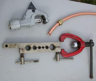 Flared fittings can only be used with soft (flexible) copper tubing The tubing is cut with a pipe cutter (upper left above) and the flare nut is slid onto the tubing. The tubing end is clamped in a flaring tool (lower left with holes) and a flaring tool (lower right) flares the tubing end. The tubing and nut is then placed on the fitting and tightened with a special pair of tubing wrenches.