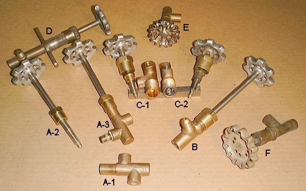 Reproduction Stanley Valves A - Triple-port valve disassembled B - Dual-port valve (Late Non-Condensers & Early Condensers) C - Large Packing Nut Style Valves D - Firewall Valve E - Early Non-condensing Era Stanley Valve F - Late Condensing Era Valve