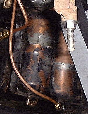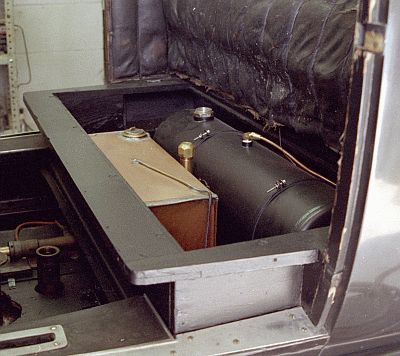 Mounted under the sub-floor boards under the front passenger seat and in front of the pump box are two tanks referred to as the service tanks. These 1-1/2 quart tanks are plumbed in series with a working pressure of 140 PSIG. The tanks are generally made from 14 gauge material. Originally drawn from brass, the tanks were made of steel by the time condensing cars were introduced since the brass tanks were found to stress crack with the constant pressure cycling. Today the tanks are available as copper reproductions since steel tanks were found to be prone to rust out due to moisture in the pressurization air condensing out and collecting in the bottom of the tanks. It was obvious that the original steel tanks that came on the car had failed long ago and had been replaced with the copper reproductions.A cushion of air in these tanks allow the pumps to fill the tanks with fuel while the air compresses thus building fuel pressure. Kerosene fuel is pumped into the bottom of one of tanks (right tank) while air can be admitted to the second tank (left tank). This arrangement allows the fuel pumps (hand or power) to pump fuel against the air pressure in the tanks and pressurize the burner fuel supply system.