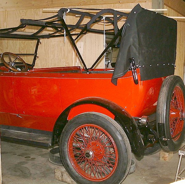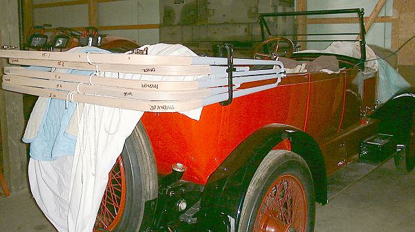 The photograph above doesn't do justice to the problem just discovered. The mechanical restoration of the car presented a number of challenges. The mechanical challenges paled to some of the ones that appeared during the restoration of the body and now the top. While the top bows were loosely sitting in the bow sockets the bows were put "down" to see how things fit in the top bow holders to either side of the car. It now became readily apparent why Marvin Klair refrained from raising and lowering the car's top ~ the rear bow didn't fit the bow holder! The bow holders at the rear of the car are designed such that when the latch is released the outer half of the holder folds away from the car. The top bows can then be dropped into the holders with ease (or at least that is the intent). When the bows and sockets were put "down" the rear bow sat very wide in the bow holder. It was possible to latch both bow holders but in so doing a lot of pressure was being applied to the bow sockets. Now it became perfectly clear where the kinks had come from on the bow socket tubes! Perhaps the only reason the tubes didn't kink easily this time was that they were filled with epoxy thus adding to their internal strength!