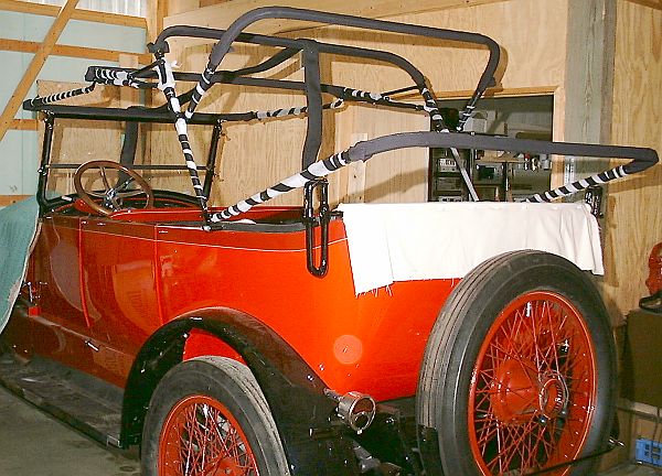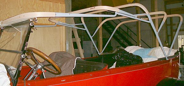The top contour is clearly seen in the above photograph. The top is in position and the next step is to apply the top material. While the three top straps pull the last bow forward, the two vertical straps maintain a downward pressure on the rear bow. The two one inch wide vertical straps are in place so that the rear fabric panel is not overly stressed by the tension of the straps pulling forward. |
