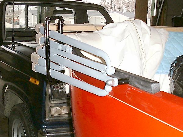 As seen in the photograph above the repair to the rear bow worked. The nice thing about the repair is that the bows would be covered with black duck cloth as shown above and thus the repair would be totally covered up. In the above photograph the top bow sockets have been painted and are covered with foam wrapping to protect the painted surface. The bows have also been covered, inserted in the bow sockets, and nailed in place. With the repair made to the rear bow the assembly would drop into the bow holders (the rear bow is seen in the above picture resting in the center of the bow holder). The wide black strap running from the center of the windshield, across the first bows, and hanging from the third bow is the 4" wide strapping material that will be stapled to each bow to set its position relative to the other bows.