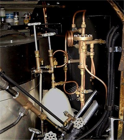 Stanley steam cars operate at steam pressures between 500 and 600 pounds per square inch depending on the setting of the steam automatic. This maximum pressure is determined by the setting of the steam automatic. As the pressure reaches the set point of the steam automatic the fuel flow to the main burner is closed off. When the steam pressure drops below the set point of the steam automatic fuel is allowed to flow to the main burner. The steam automatic has a pressure sensing diaphragm at its upper end which is piped to the top of the boiler. At the bottom of the steam automatic is a valve which controls the flow of fuel to the burner.