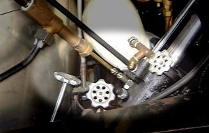 The blow off is perhaps the simplest mechanical device on a Stanley. It is nothing more than a valve. It is plumbed into the bottom of the boiler such that when the valve is open water from the bottom of the boiler is exhausted. Closing the valve stops the operation. All water sources contain impurities. Additionally there is steel piping in the water system that will rust and other opportunities for dirt and such to find its way to the boiler. In fact, all Stanley cars were equipped with steam syphons that allowed water to be sucked up from a horse trough or a stream alongside the road and these obviously would include all sorts of questionable material. When you've driven the car for several hundred miles you must "blow down" the boiler. This process simply exhausts the water from the boiler that has become concentrated with impurities. You then replenish the water blown out of the boiler with fresh and start the process over again. The photo at the left shows three of the six blow down valves installed on my car. The left one blows down the front left portion of the boiler while the middle valve is for blowing down the left rear portion of the boiler. One of the special purpose blow downs is the valve to the right that is for blowing out the boiler water level indicator to insure it remains clear of residue and continues to function properly. |