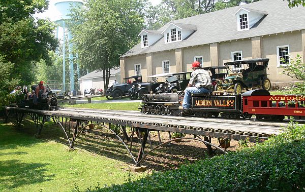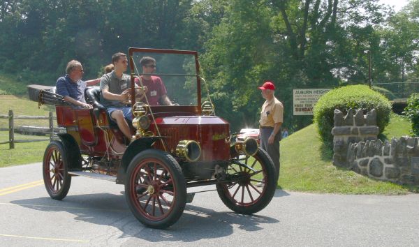 Steve Eckel, driving the family's 1908 Model F, arrives at Auburn Heights. After a hearty lunch and generous portions of Woodside Farm Creamery ice cream, tour participants enjoyed rides on the the Auburn Valley Railroad’s 1/8-size live-steam trains, rides in the 1915 Stanley Mountain Wagon as well as rides in the 1916 Rauch & Lang electric car. For most, the highlight was touring the Marshall home built in 1897. |