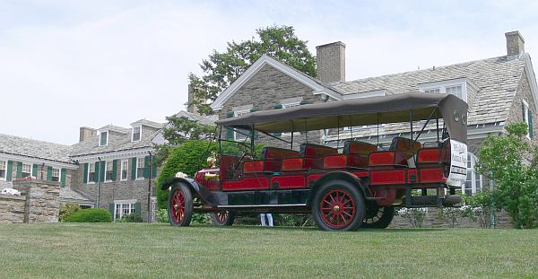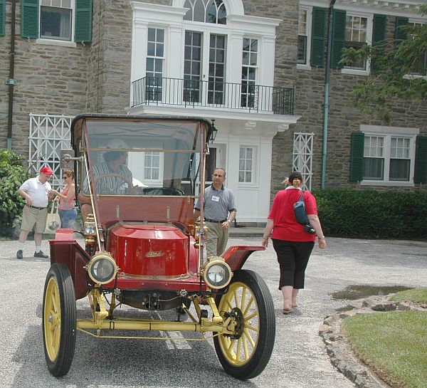 Curt Fullum from Punta Gorda, Florida arrives at Granogue in his 1910 Model 60 Stanley. Built in 1923 and constructed of Germantown granite, the stone contains platelets of mica that sparkle in the sunlight. The floors are concrete finished in teak wood. The gardens and greenhouses reflected Mrs. DuPont’s interest in horticulture. Guests dined on the patio and listened the world's finest classical organists play the Aeolian Organ. Installed when the house was built and recently restored, an Aeolian organ with roll player was indeed “the final touch of beauty for the well-planned home.” |